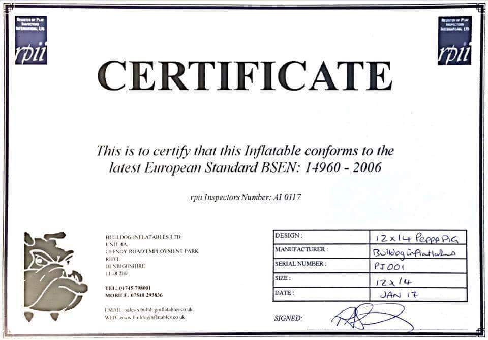 All inflatables have either a current PIPA test certificate or RPII test certificate for 2017.